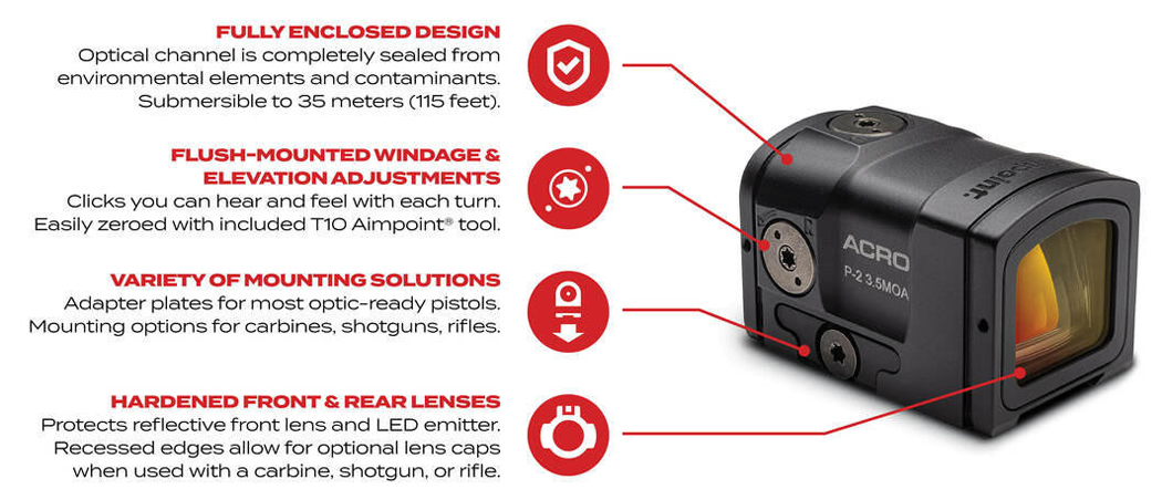 The GLOCK 19 Gen5 paired with the Aimpoint ACRO P-2 is a proven, duty-grade setup that balances reliability, durability, and modern performance. The Gen5 G19 offers improved ergonomics, ambidextrous controls, and the enhanced Marksman Barrel for consistent accuracy, while the MOS variant allows direct mounting of optics. Combined with the enclosed-emitter ACRO P-2, which is known for its rugged construction and ability to perform in harsh conditions. This setup delivers fast target acquisition and dependable operation in adverse environments. Together, they form a highly capable defensive or duty platform that emphasizes simplicity, durability, and real-world effectiveness.